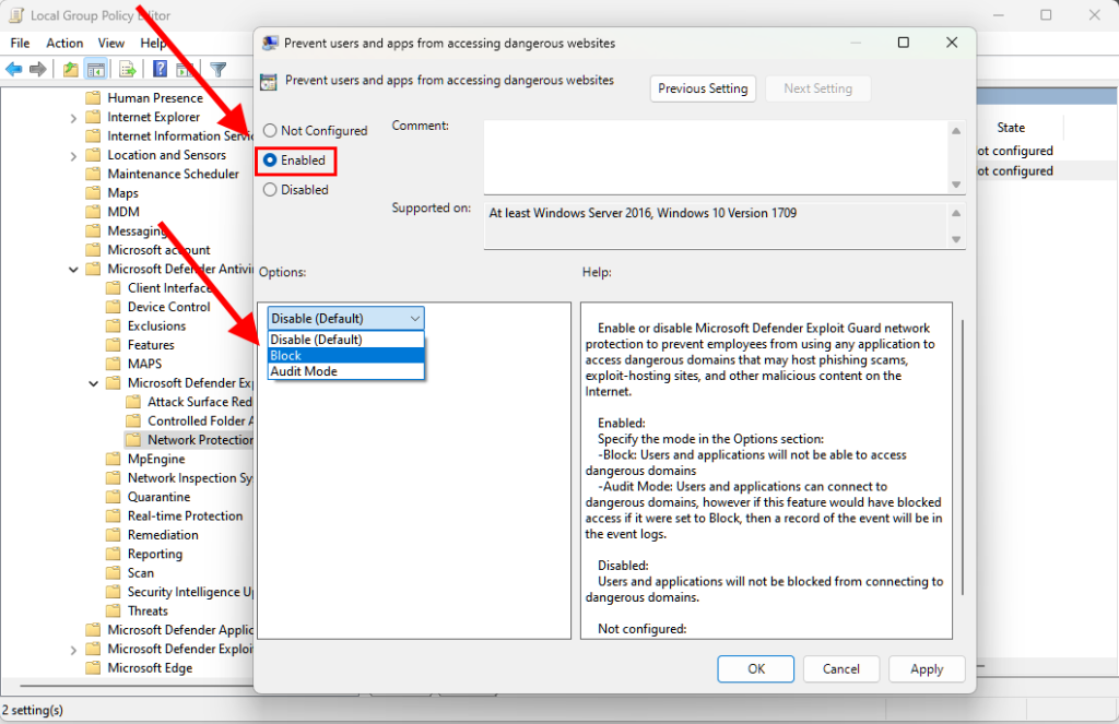 Computer Configuration > Administrative Templates > Windows Components > Microsoft Defender Antivirus > Microsoft Defender Exploit Guard > Network Protection - Tìm tùy chọn “Prevent users and apps from accessing dangerous websites”.