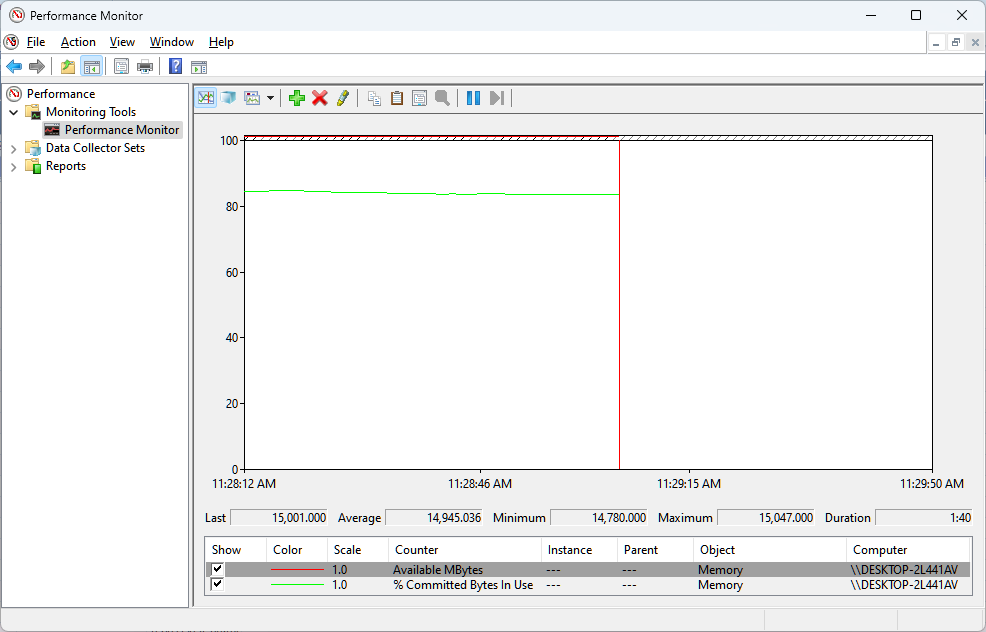 2. Vào mục Performance Monitor, thêm các bộ đếm (counters) để giám sát các yếu tố như tốc độ đọc/ghi ổ đĩa, CPU và RAM.