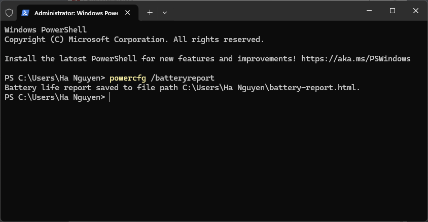 • Kiểm tra pin laptop: Xem trạng thái và dung lượng thực tế bằng Command Prompt với lệnh: powercfg /batteryreport