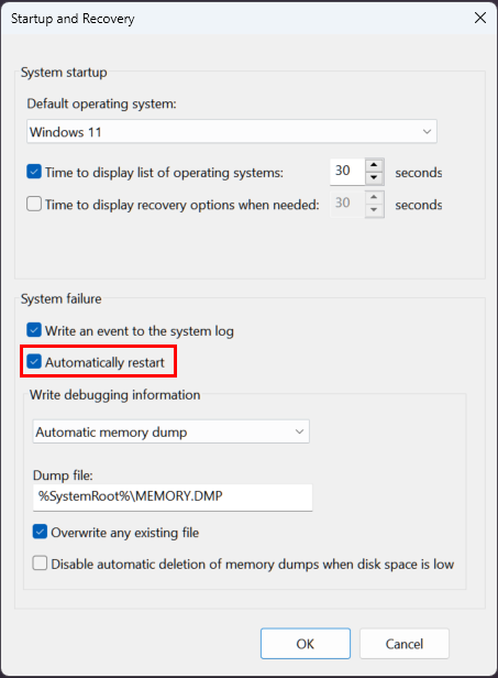 - Cài đặt trong hệ thống: Tùy chọn “Automatically restart” trong Windows bật lên khi xảy ra lỗi.