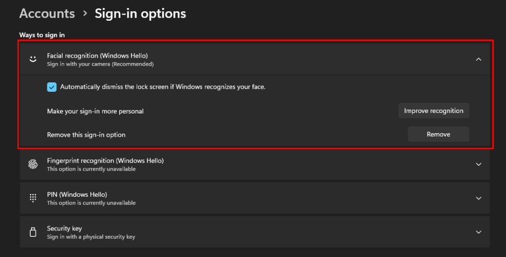 - Nếu dòng Enhance facial recognition protection xuất hiện, nghĩa là máy bạn hỗ trợ tính năng này.