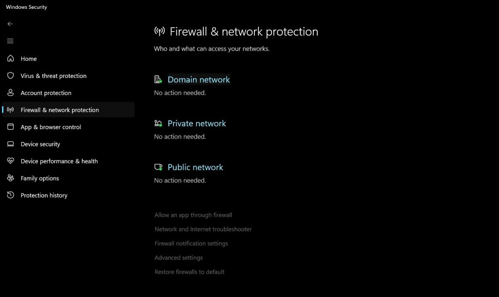 • Trong cửa sổ Windows Security, chọn Firewall & network protection.