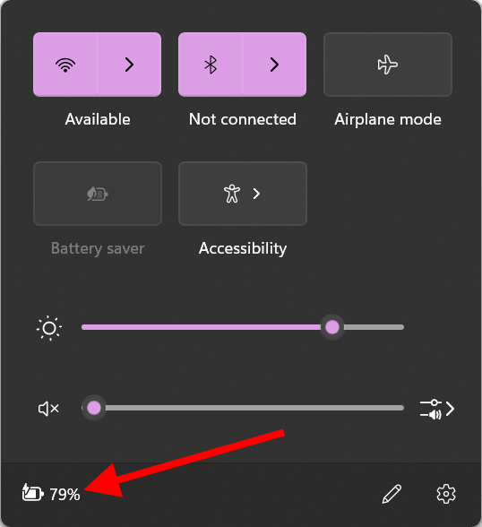 - Trong bảng Quick Settings, bạn sẽ thấy tên pin và phần trăm còn lại ngay bên dưới biểu tượng pin.