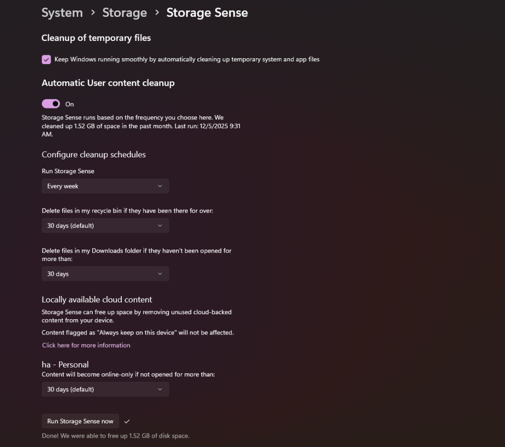 3. Cấu hình Storage Sense tự động tối ưu nhất
