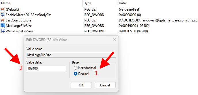 - MaxLargeFileSize: Dung lượng tối đa file PST/OST (tính bằng MB).