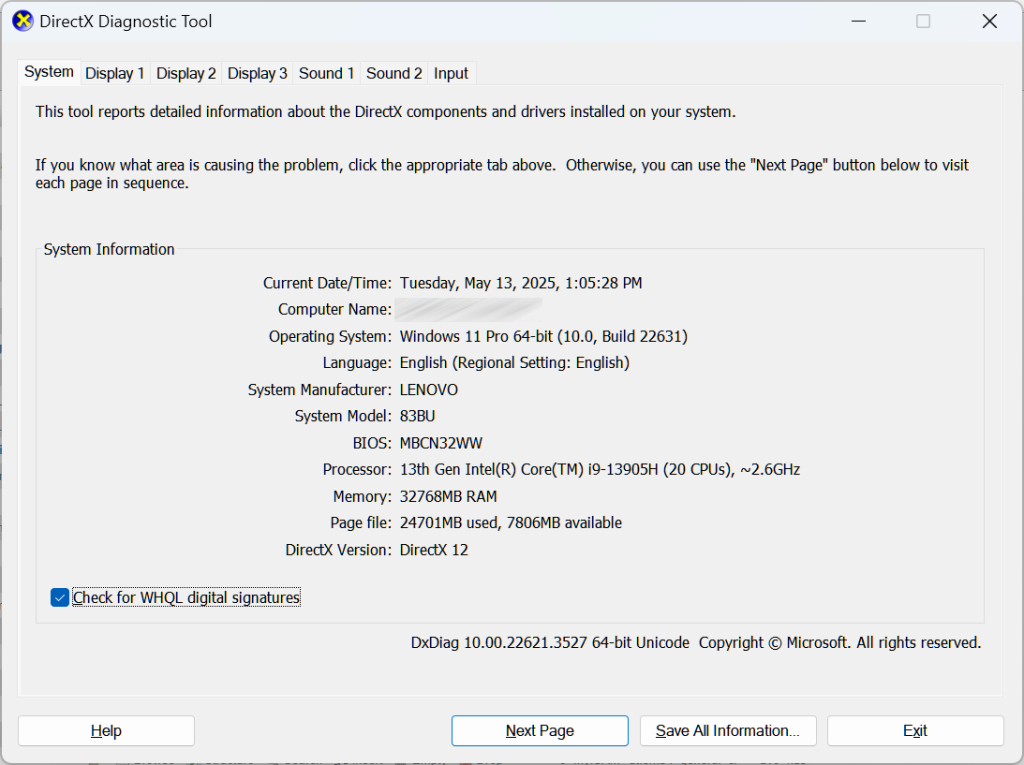 Bước 2: Công cụ DirectX Diagnostic Tool sẽ hiện thông tin về hệ thống, màn hình (GPU), âm thanh…