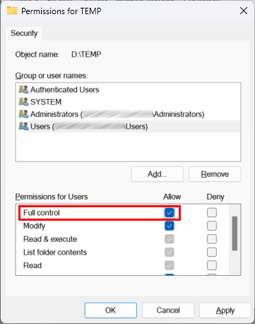 - Chọn tài khoản người dùng của bạn, sau đó tick vào Full control để cấp quyền đầy đủ.