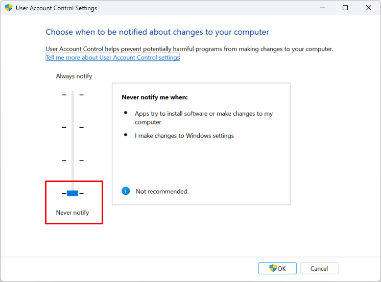 - Kéo thanh trượt xuống Never notify và nhấn OK.