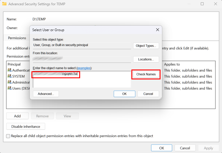 - Nhập tên tài khoản người dùng của bạn > Check Names > OK.