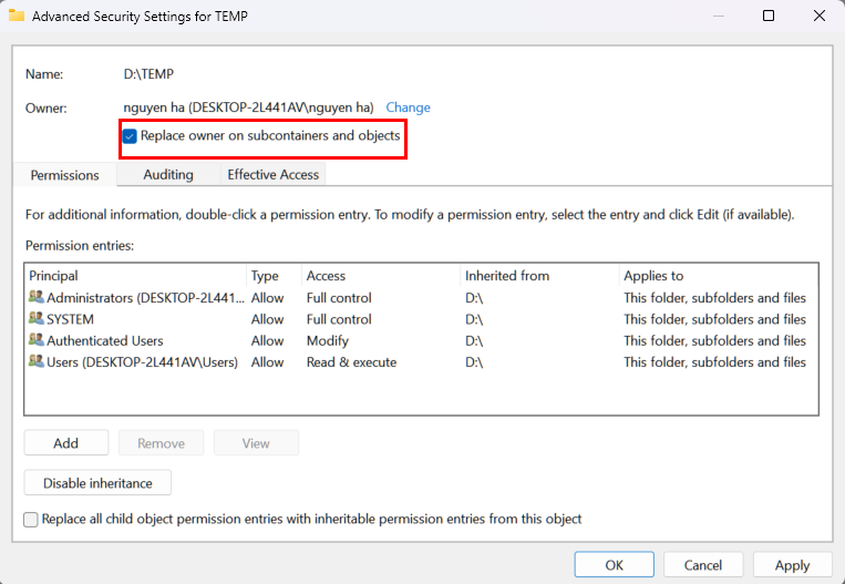 - Tích chọn Replace owner on subcontainers and objects, nhấn OK để áp dụng.
