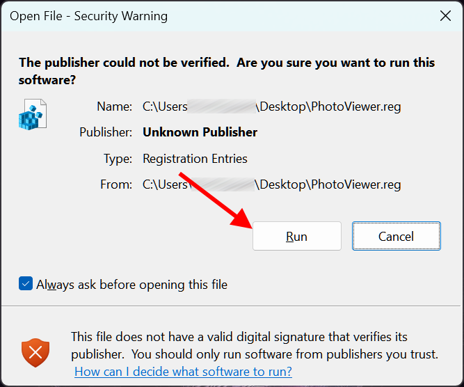 PhotoViewer.reg. - Nhấp đúp vào file PhotoViewer.reg để chạy, chọn Yes để xác nhận.