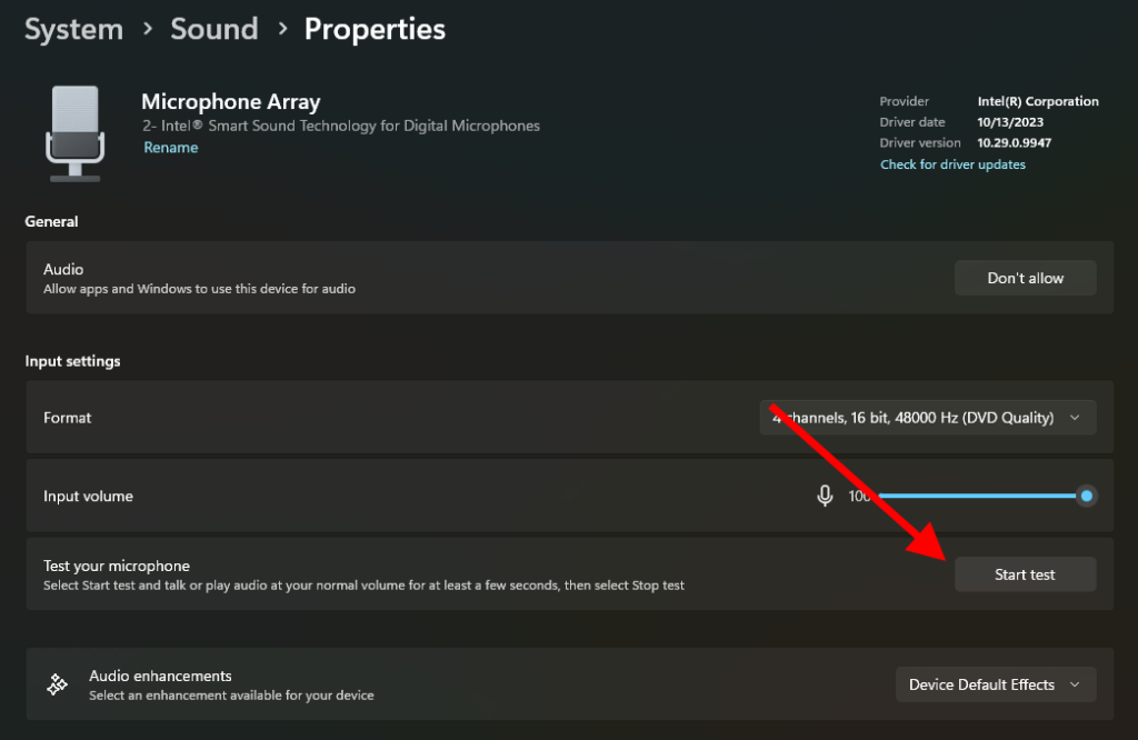 • Nếu có, hãy thử nói vào micro, nếu thanh “Input volume” không di chuyển, tiếp tục kiểm tra.