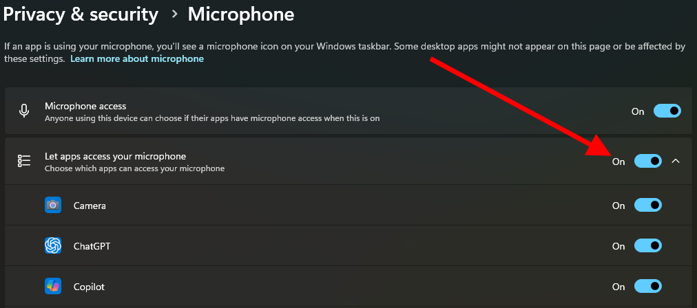 3️⃣ Đảm bảo Microphone accessLet apps access your microphone đều đang bật.