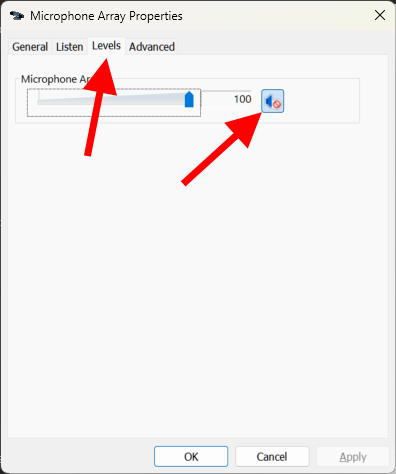 2️⃣ Tìm tab Recording → chọn thiết bị Microphone Array → chuột phải Properties → chọn tab Levels → kiểm tra đảm bảo biểu tượng loa không bị Mute.