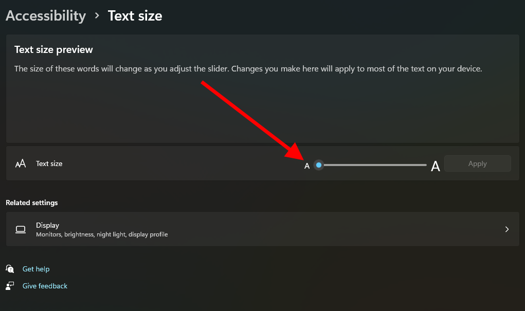 - Kéo thanh trượt để chọn kích thước chữ mong muốn và nhấn Apply.