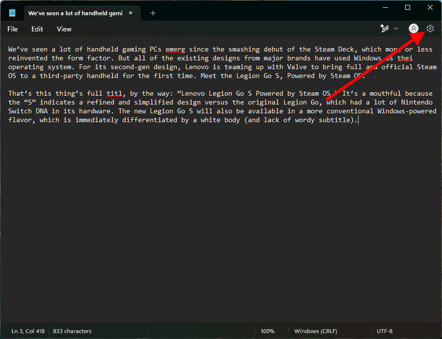 - Trong Notepad, nhấn vào biểu tượng bánh xe ở góc trên bên phải.