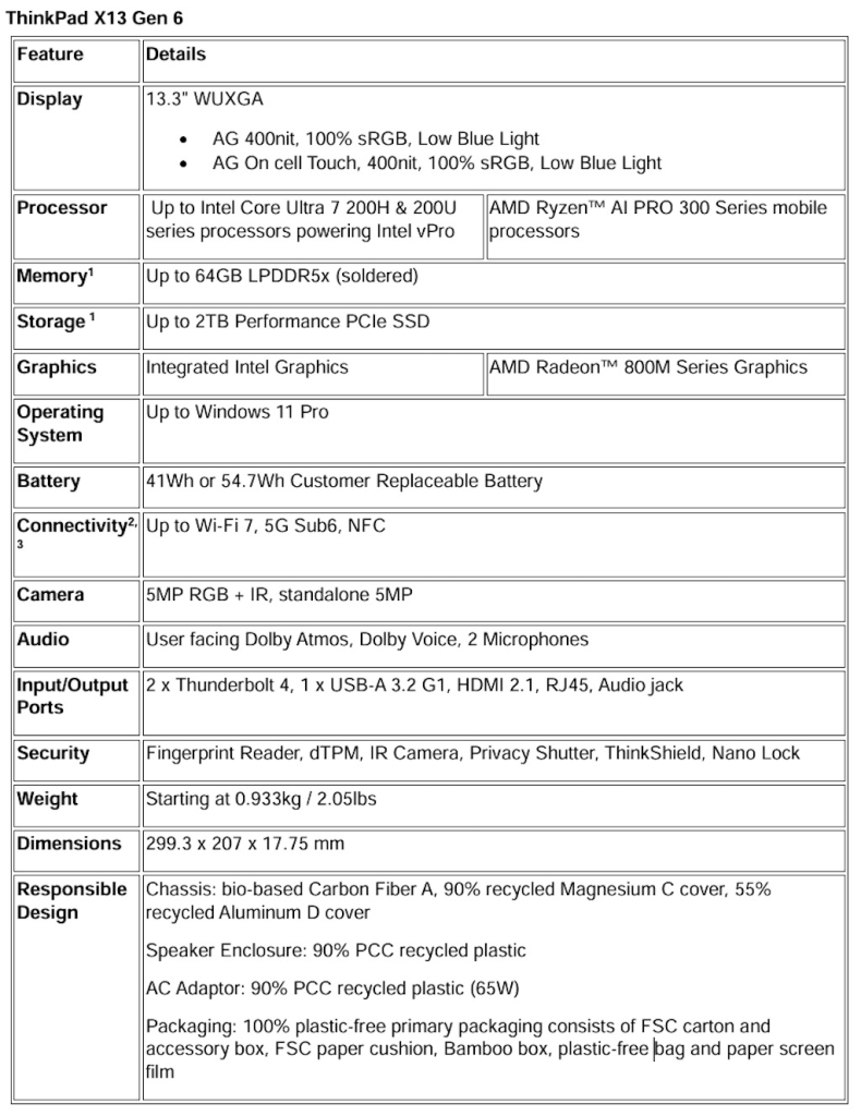 Lenovo ThinkPad X13 Gen 6 đã trở thành chiếc máy tính xách tay ThinkPad nhẹ nhất hiện nay với trọng lượng dưới 1kg. Về CPU, AMD Ryzen AI 300 hoặc Intel Arrow Lake sẽ được cung cấp.